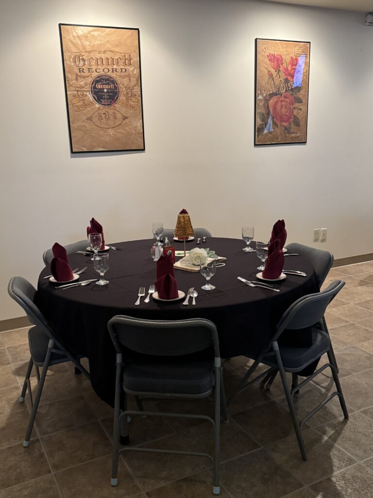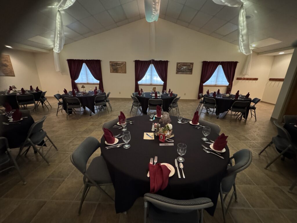 Available equipment includes a podium, microphone, projector, retractable screen, and a mounted 55″ TV/Monitor. The room also features a microwave, sink, two restrooms, a large custom-made buffet on wheels, as well as round and rectangular tables with padded chairs. We do not supply table linens, glassware or table service. Rates start $350.